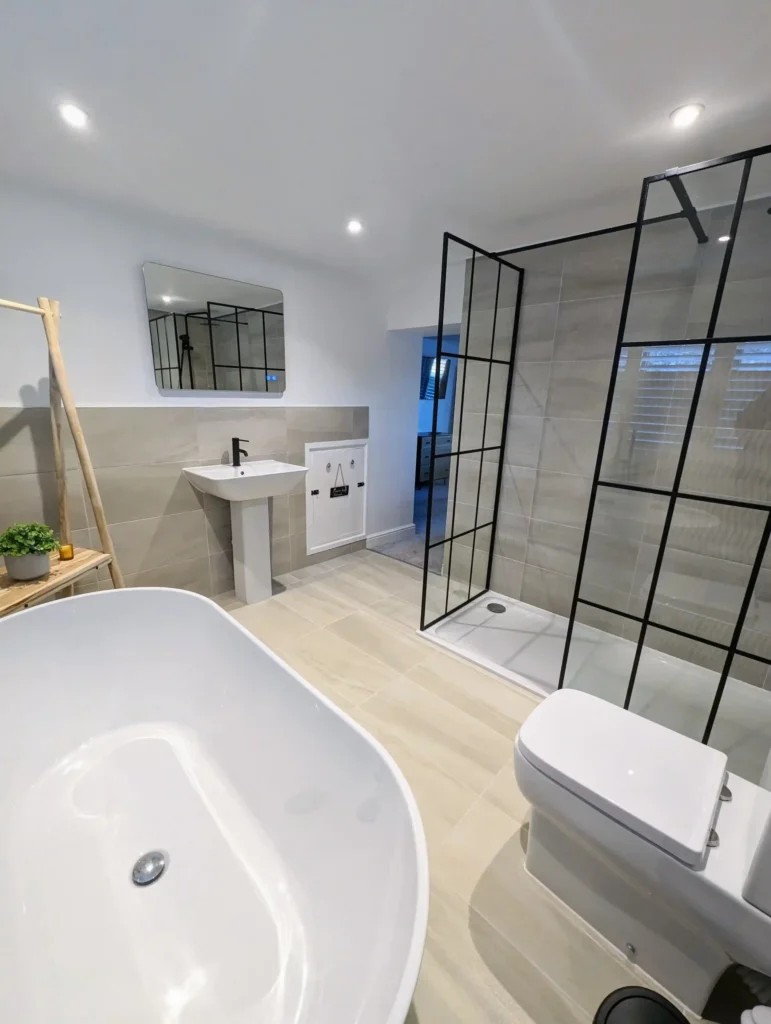 • A large family bathroom with a freestanding bath and a walk-in shower with a Crittall-style screen
